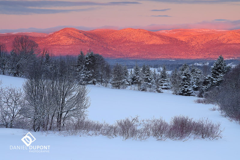 Lors de cet atelier de 5 jours, nous tenterons de faire des photos d’au minimum un lever de soleil, possiblement deux si la météo nous le permet. J’ai repéré quelques endroits où nous pourrions immortaliser les premiers rayons du soleil sur les montagnes enneigées.