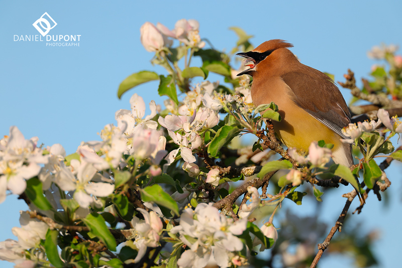 À cette période de l’année, les arbres fruitiers de mon jardin et du boisé sont en floraison, ce qui attire une multitude de passereaux, dont le Jaseur d’Amérique qui niche chez moi et qui est abondant en mai.
