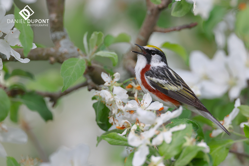 La floraison printanière dégage une substance sucrée qui attire des insectes qui eux attirent des parulines. En général, à cette période de l’année, plusieurs espèces s’alimentent dans le pommier sauvage à l’arrière de la maison et dans les pommetiers à l’avant de la maison.