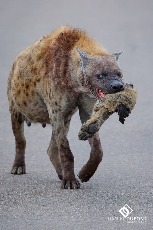 Lors de la première journée de repérage, j’ai réalisé cette photo d’une hyène âgée courant sur la route avec une patte de Lion dans la gueule. J’étais seul dans le véhicule à croiser la route de ce prédateur et j’ai été estomaqué lorsque j’ai réalisé ce qu’elle avait dans la gueule.