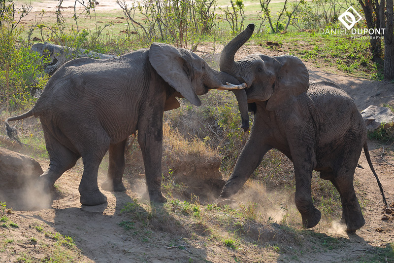 Nous observons des Éléphants tous les jours dont certaines femelles allaitant leurs jeunes, mais cette scène de combat entre deux mâles nous a impressionné.