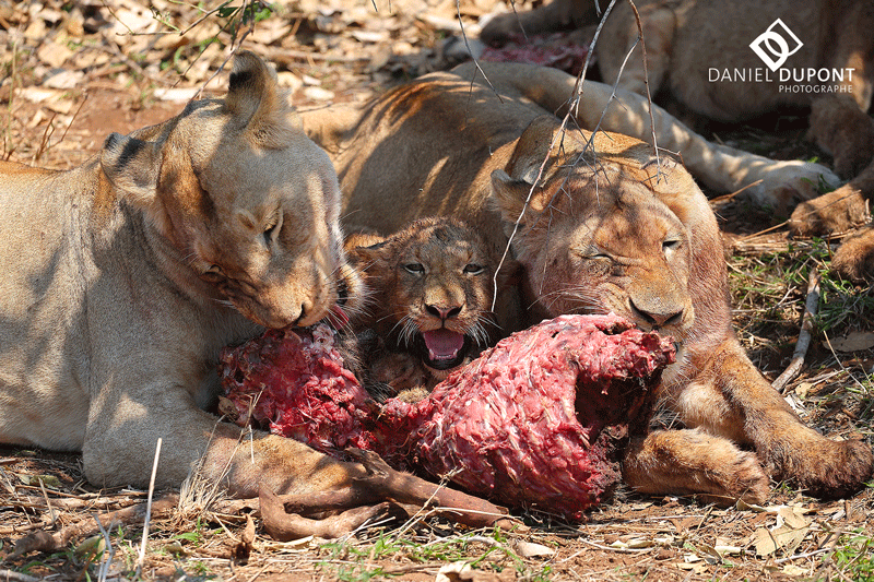 Contrairement à l’année dernière où nous avions trouvé plusieurs carcasses accessibles, celles que nous avons trouvées cette année étaient moins dégagées et proches de la route. Nous avons toutefois trouvé un groupe de trois femelles avec des Lionceaux qui s’alimentaient d’un Phacochère.