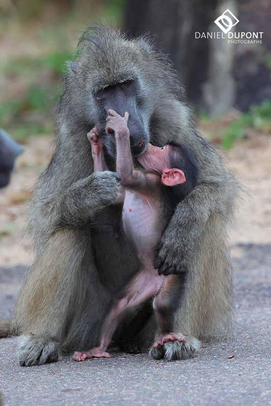 Lors de nos déplacements dans le parc, nous avons croisé plusieurs troupes de Babouins, dont cette femelle dans une scène intimiste avec son jeune.