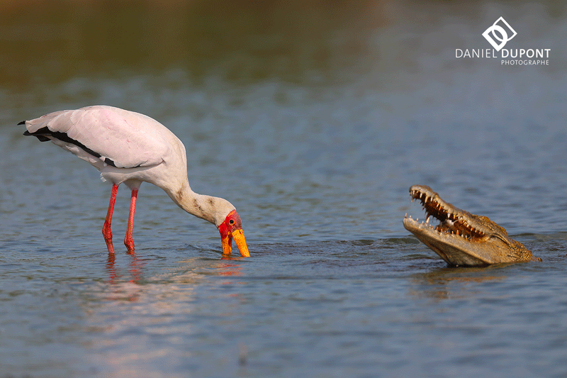 Cette image demeure d’un grand intérêt puisqu’elle illustre les deux espèces en chasse et le croco a un poisson dans la gueule.