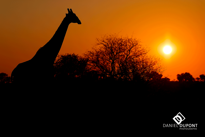 J’ai obtenu ce résultat en sous exposant fortement l’exposition pour obtenir ainsi un ciel coloré et la silhouette de la Girafe. Pour réussir des images similaires, employez la visée arrière afin de protéger vos yeux de la puissance des rayons du soleil.