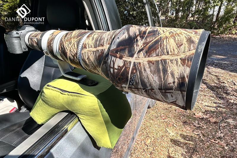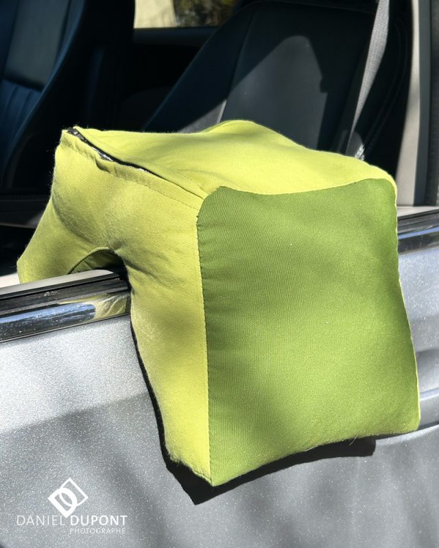 Le sac est généralement posé sur le rebord de la fenêtre de la voiture, et l’objectif est déposé dessus. Le sac offrira plus de stabilité et de confort pour la prise de vue.